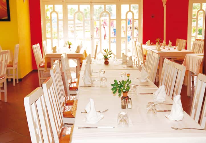 • RESTAURANT « L’HACIENDA » : Buffets variés, à thèmes, plats froids ou chauds. Cuisine tunisienne et internationale avec terrasse ombragée. Boissons comprises (Eau, Sodas, Bière locale, vins rouge, blanc, rosé ) – Petit déjeuner : De 07H00 à 10H00 – Petit déjeuner Continental : (au bar piscine) De 10H00 à 11H00 – Déjeuner : De 12H30 à 14H30 – Dîner : De 19H00 à 21H30 • TROIS RESTAURANTS DE SPECIALITES : De 19H30 à 22H00 (Réservations 24 Heures à l’avance) – RESTAURANT ITALIEN : « DOLCE VITA » – RESTAURANT TUNISIEN : « CARTHAGE » – RESTAURANT GRILL : « EL RANCHO » • SNACK PISCINE « CAYO LARGO » : De 11H30 à 16H00 Une ambiance chaleureuse pour savourer une cuisine légère (Sandwiches, pizzas, grillade du jour, salades, accompagnement chauds, Frites) • LE BAR CENTRAL « COHIBA » : De 10H00 à 23H00 Eau, sodas, boissons rafraîchissantes, jus de fruits, cocktails, vins locaux (rouge, rosé, blanc), bière locale, Café et thé, liqueurs locales • LE BAR PISCINE « CAYO COCO » : De 10H00 à 18H00 Eau, Sodas, Café et Thé, Jus de fruits, cocktails, vins locaux (rouge, rosé, blanc), bière locale Petit Déjeuner continental : De 10H00 à 11H00 • LE BAR PLAGE : « COCONUT » : De 10H00 à 17H00 Situé sur la plage du Caribbean World Hammamet : Eau, Sodas, jus de fruits